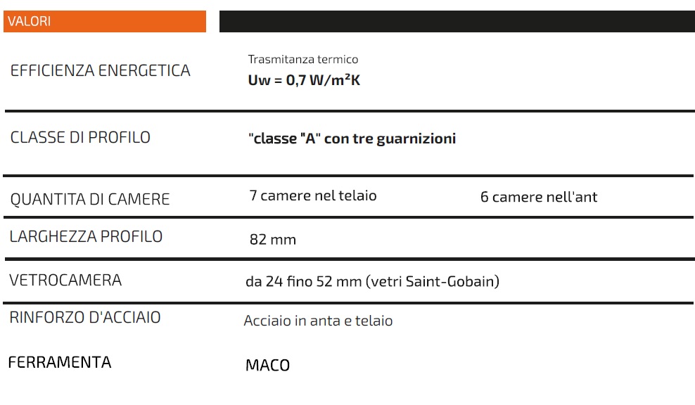 - trasmitanza termica fino a Uw=0,74 W/m²K usando tripla lastra