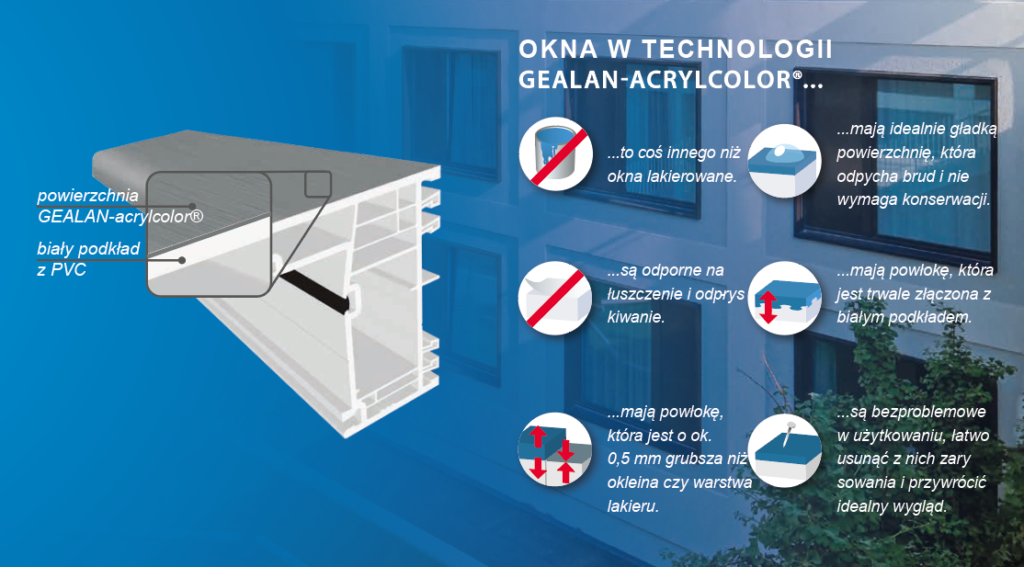 GEALAN oferuje różne możliwości, jeśli chodzi o wykańczanie kolorystyczne okien z PCW. Jedną z nich jest sprawdzona technologia powierzchniowa GEALAN-acrylcolor®. Kolorowa warstwa akrylowa jest odporna na zadrapania, łatwa w pielęgnacji i odporna na warunki atmosferyczne. Okna pomalowane w technologii GEALAN-acrylcolor® spełniają tym samym najwyższe wymagania techniczne i użytkowe stawiane innowacyjnym barwnym powierzchniom.